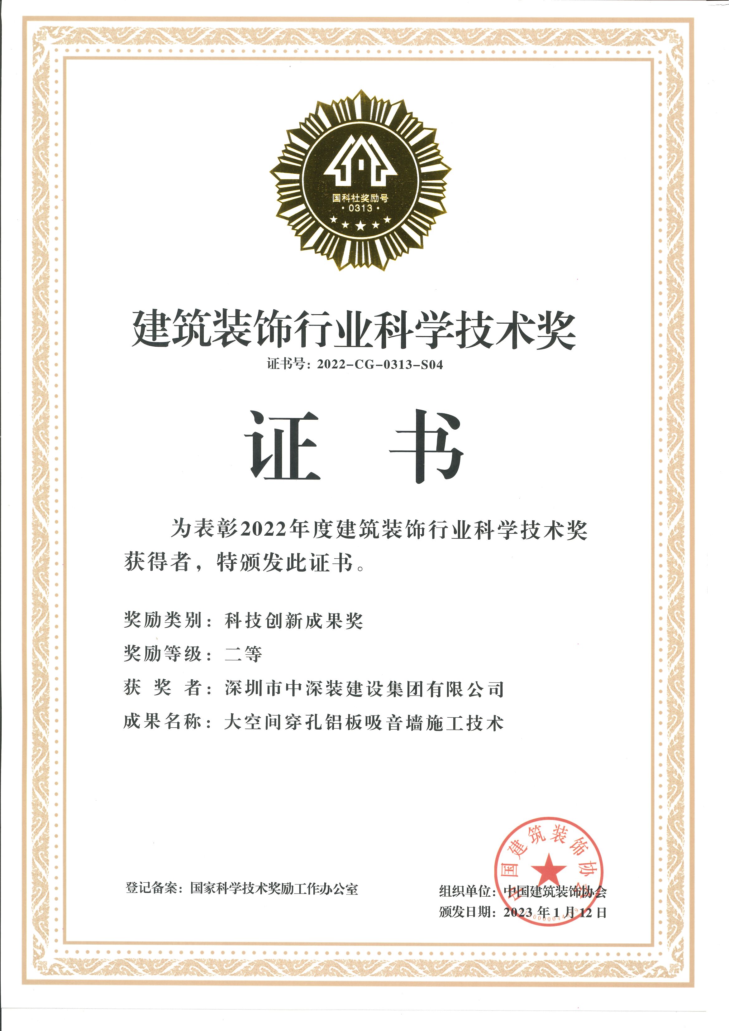 2022年度建筑装饰行业科学技术奖-大空间穿孔铝板吸音墙施工技术