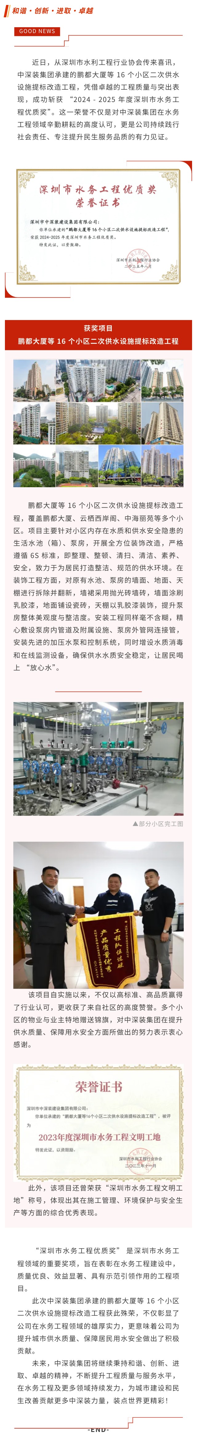 喜报|中深装集团承建鹏都大厦二次供水项目荣获“深圳市水务工程优质奖