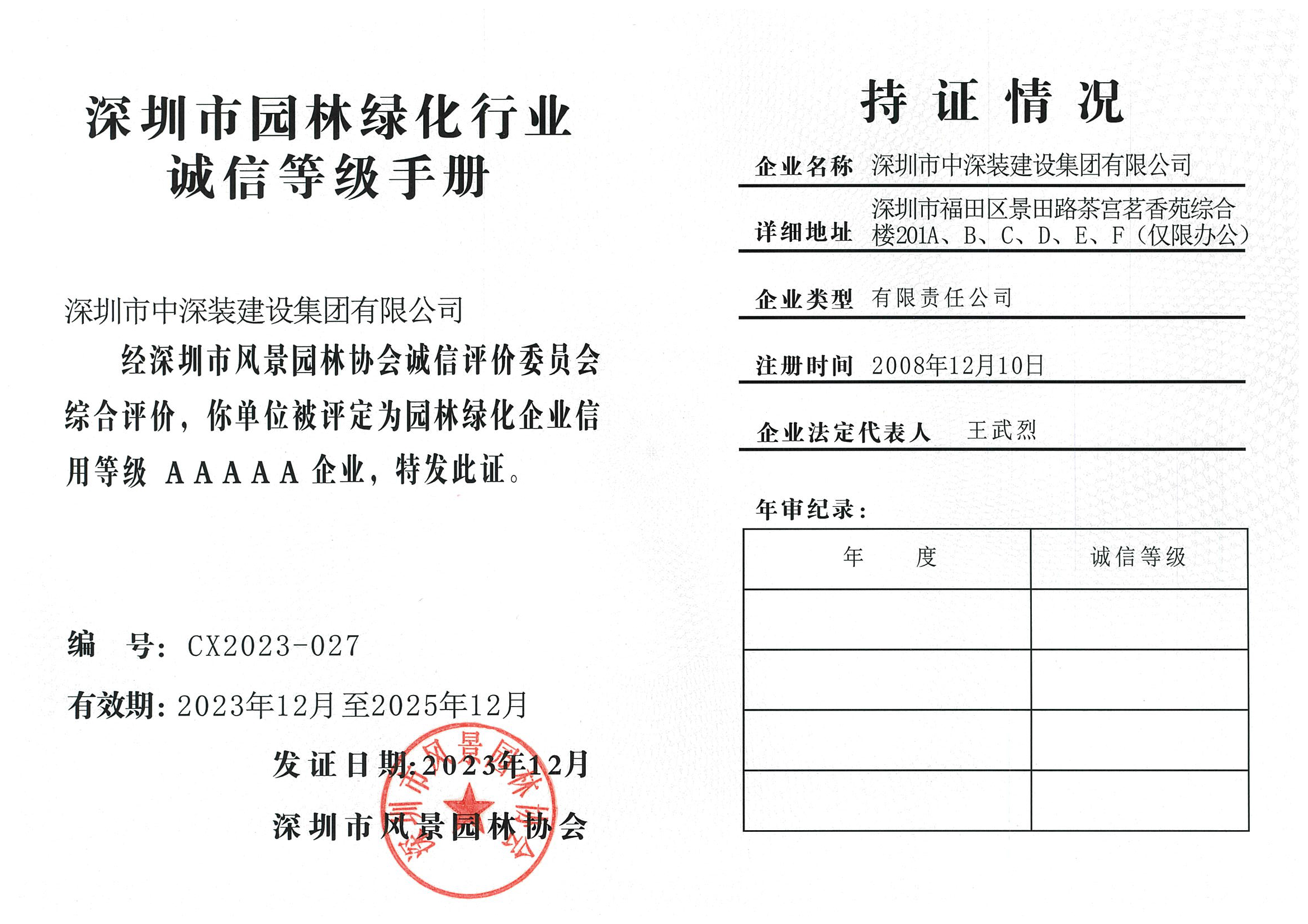 深圳市园林绿化企业信用等级 AAAAA 企业